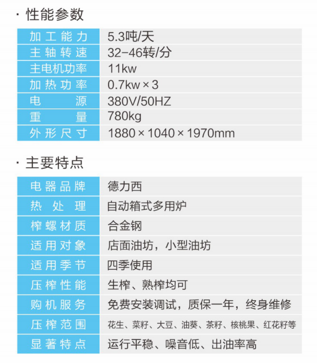 ★壓榨范圍:花生、大豆、菜籽、油葵、茶籽、芝麻等;★適用對(duì)象:店面油坊和微小油坊;★壓榨性能:熱榨一次榨盡,免費(fèi)安裝調(diào)試